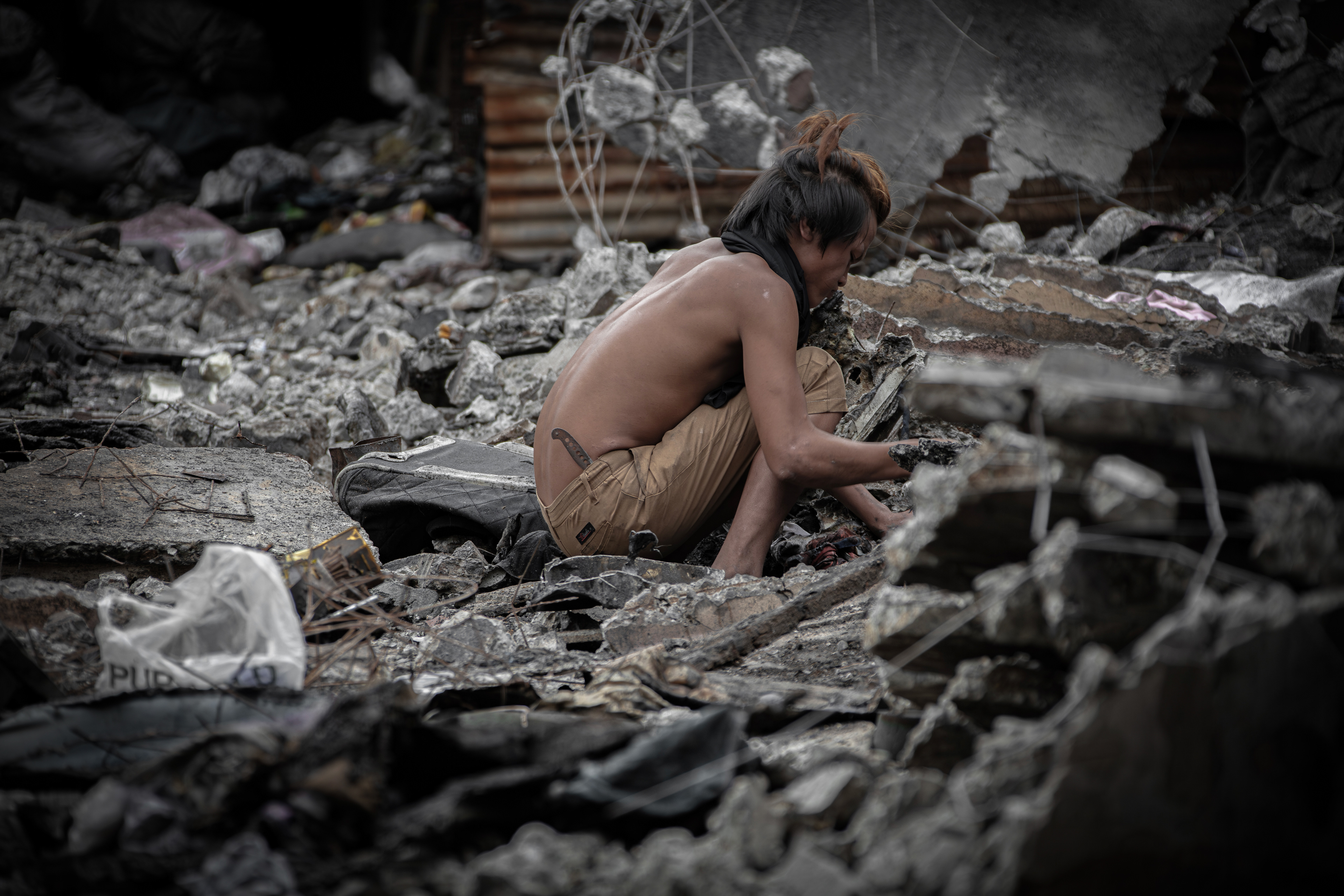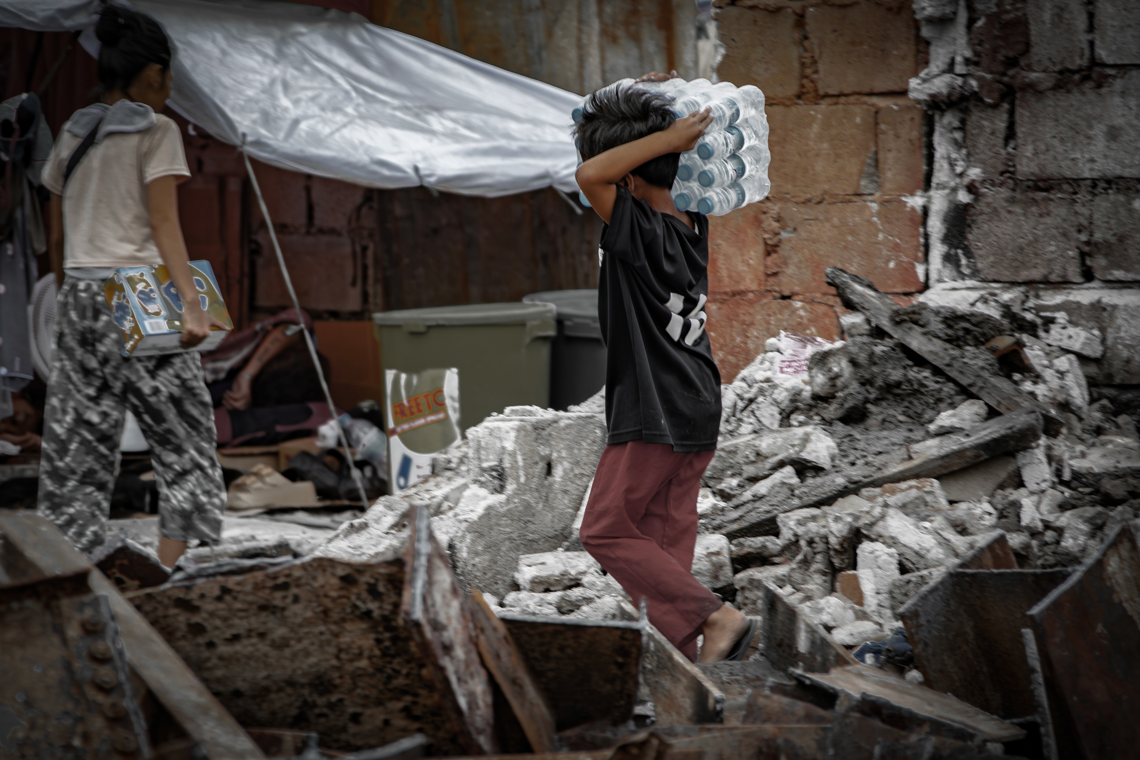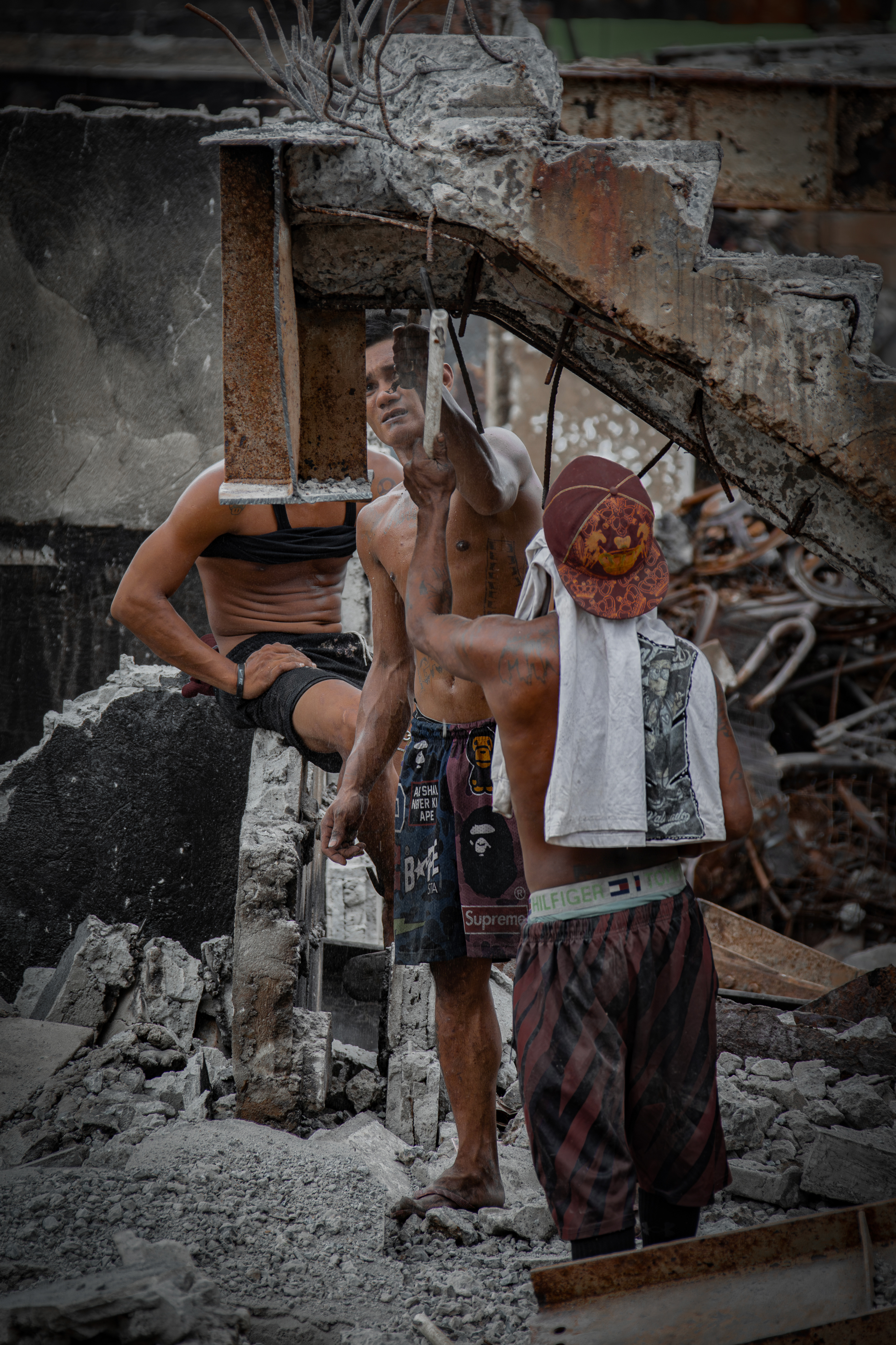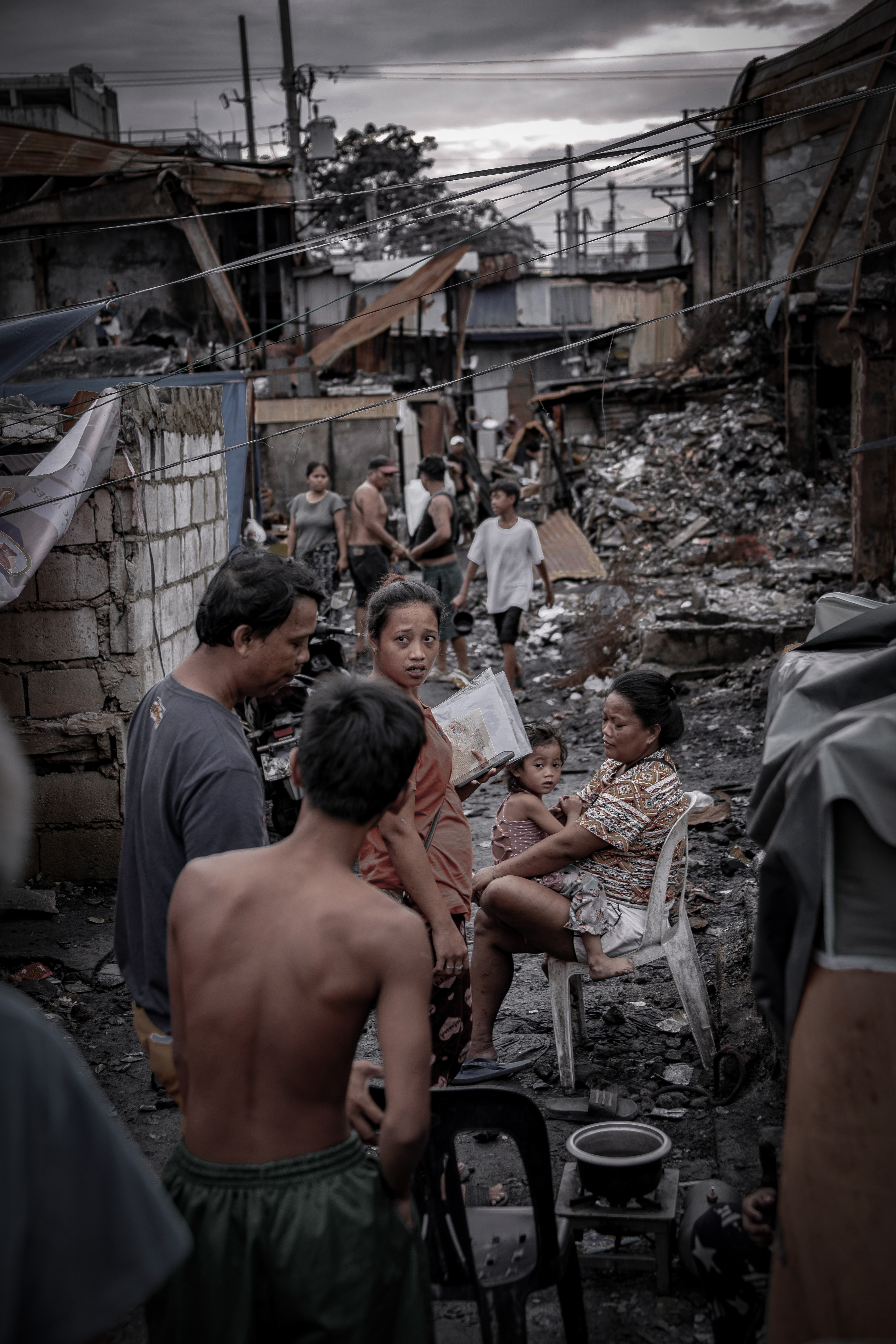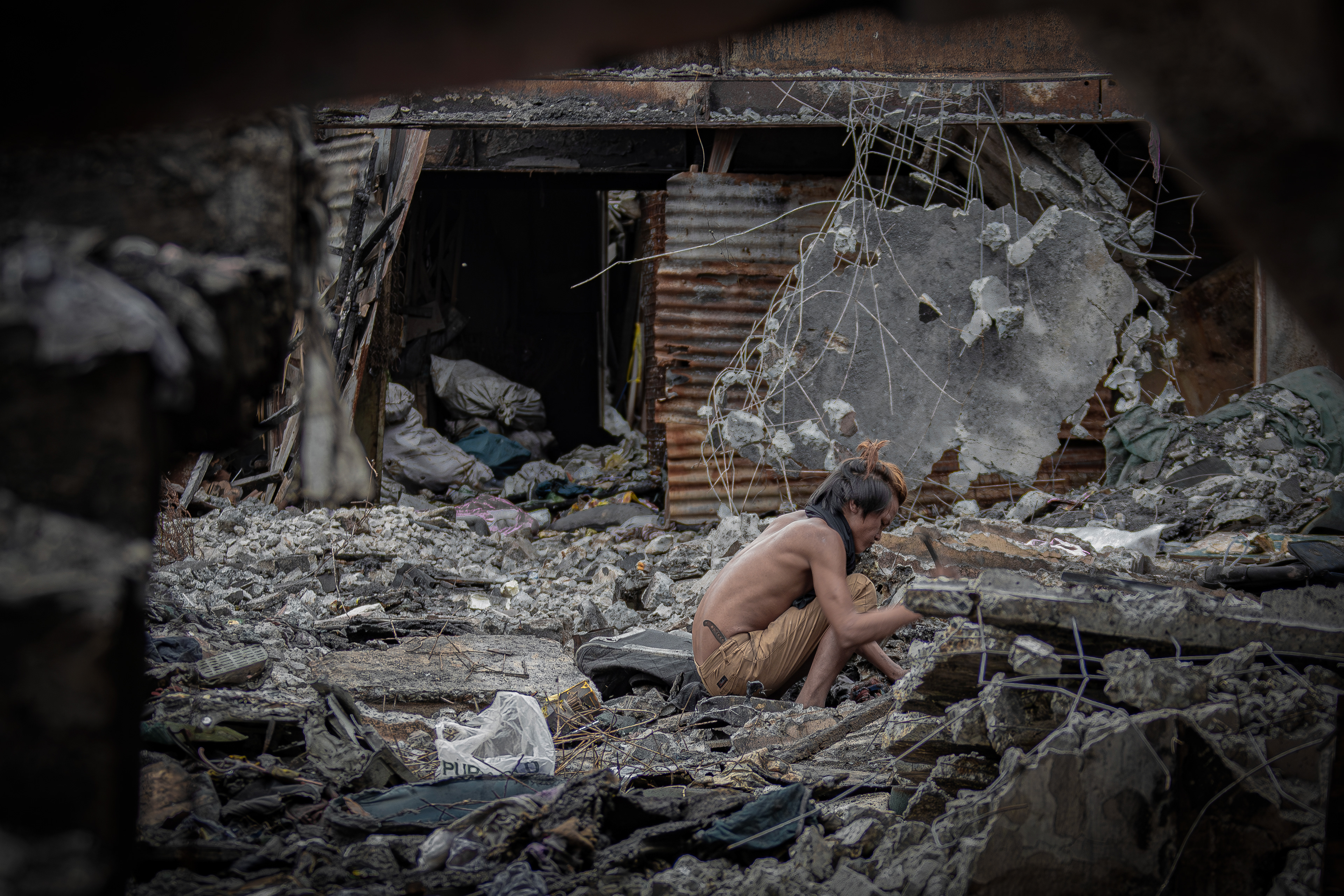 私が現地に行く5日前に大規模な火災があったばかり。密集した住宅はおよそ150棟が失われた。焼け野原には重機もなく。まともな道具すらない。寡黙に人力でガレキを片付ける漢たちの姿に心を打たれた。そして温かい笑顔で受け入れてくれた住人たちには感謝する。1日も早くよみがえってさらに豊かになることを心から祈る。A major fire had occurred just five days before I visited the area. Due to the close proximity of the buildings, it seems that around 150 buildings were lost. There was no heavy machinery in the burnt ruins. Not even proper tools. I was moved by the sight of the men silently clearing away the rubble by hand. I am also grateful to the residents who welcomed me with warm smiles. I sincerely hope that the area will recover as soon as possible and become even more prosperous.